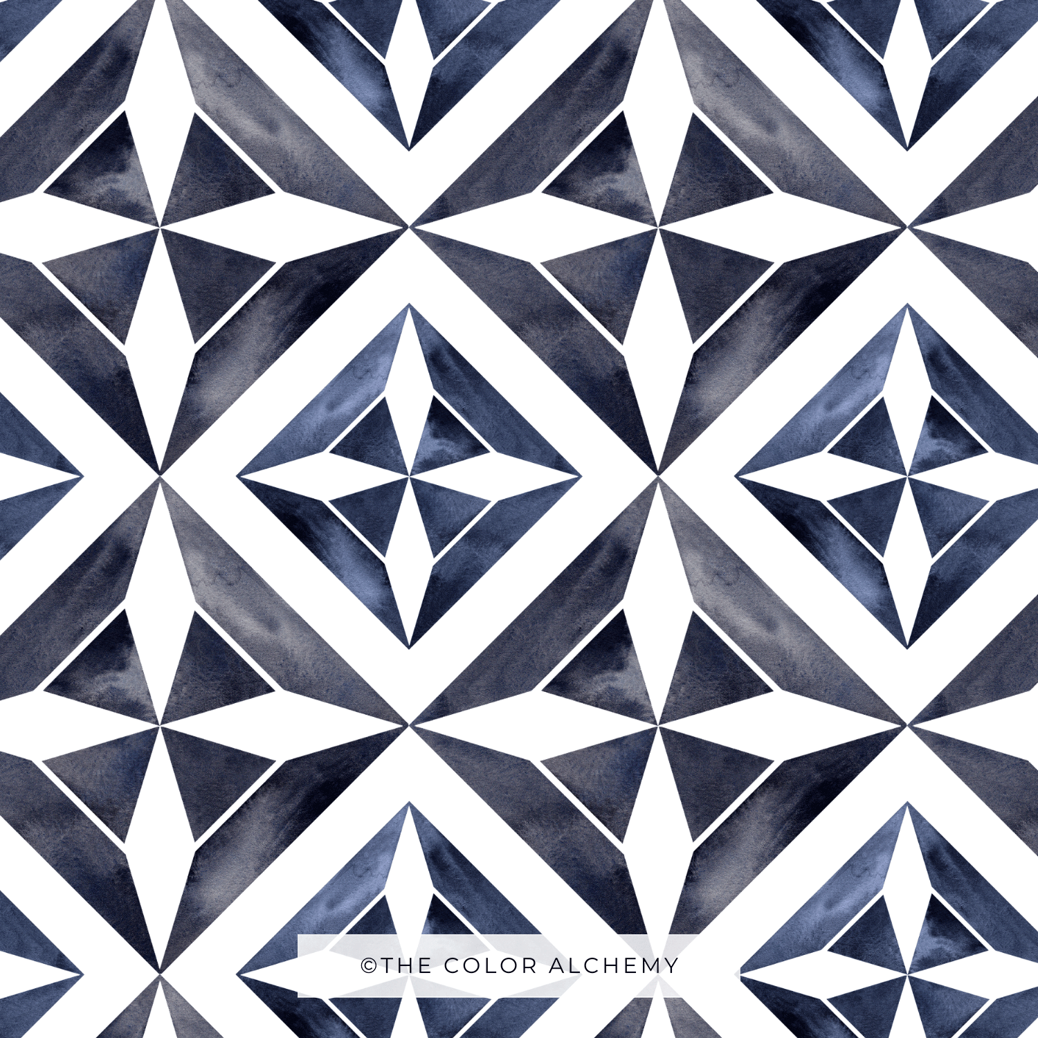 Each design is carefully hand-painted in watercolor, using deep Payne’s Grey and Midnight Blue on a crisp white background. With over a dozen unique repeat patterns, this collection brings together bold lines, layered shapes, and intricate symmetry.