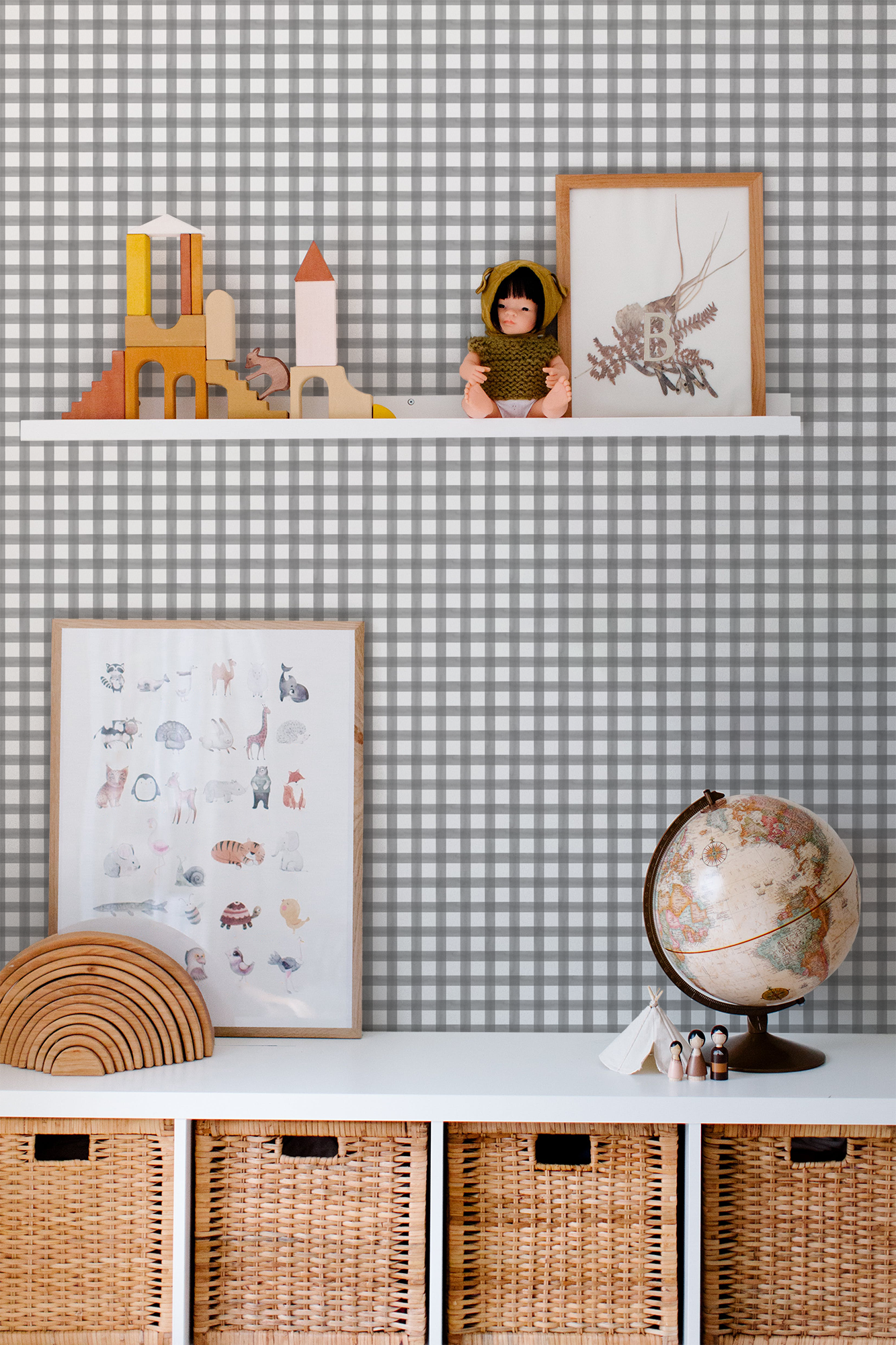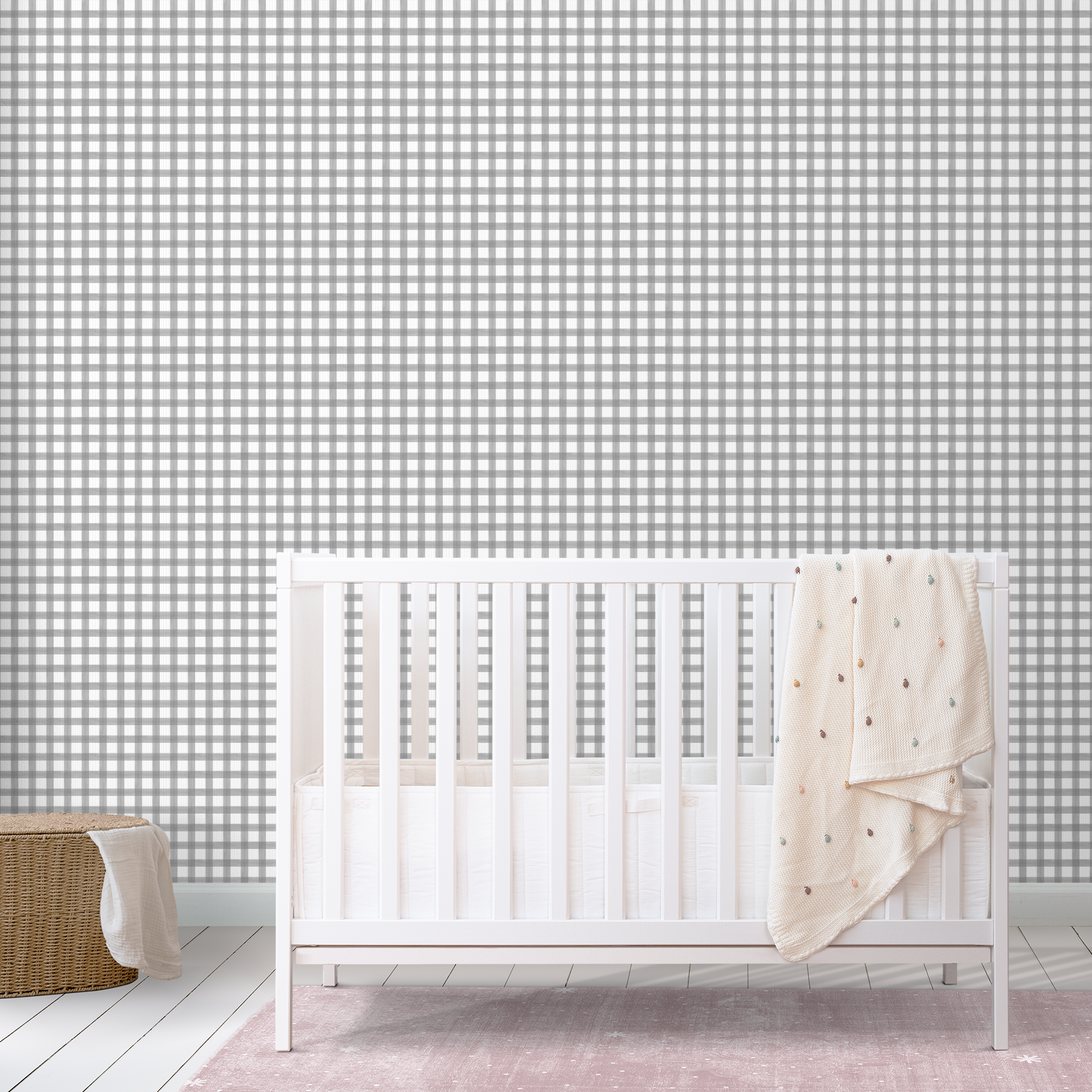 Let the wallpaper become the quiet focal point of the room. A soft gingham pattern provides gentle structure, so the rest of the space can remain light, simple, and uncluttered.